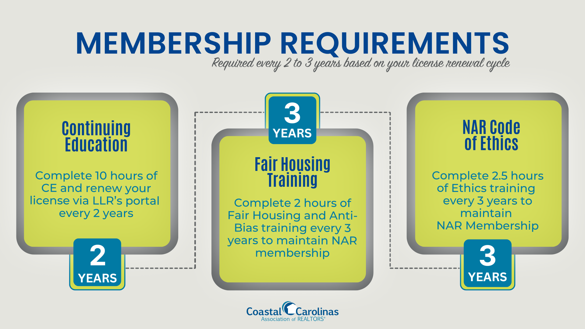 We are excited to welcome you as a new member of the Coastal Carolinas Association of REALTORS®! We hope the resources below will be useful as you begin your journey on the Grand Strand and discover what's next. Feel free to contact our Membership Department at 843-626-3638 with any questions.
